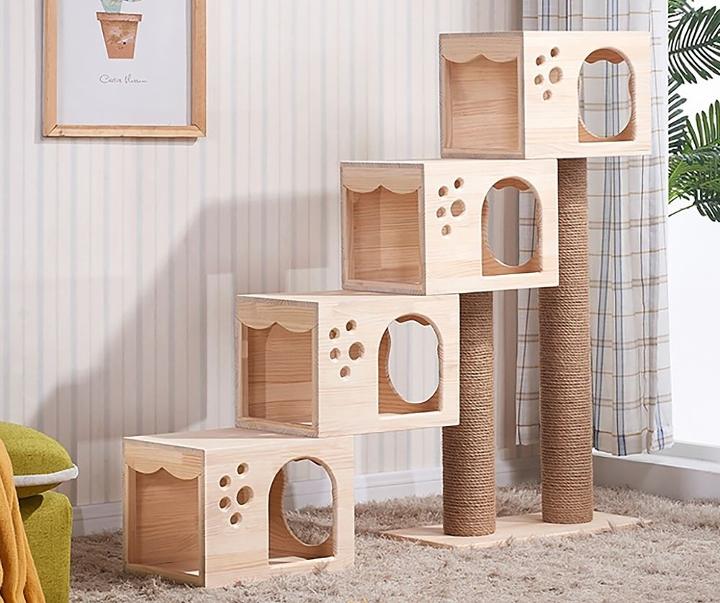 Aunque puedes encontrar varios tipos de rascadores para gatos, lo ideal es que adquieras uno con diversos espacios como cuevas, hamacas, un mirador y por supuesto muchos espacios para rascar sus uñas.
