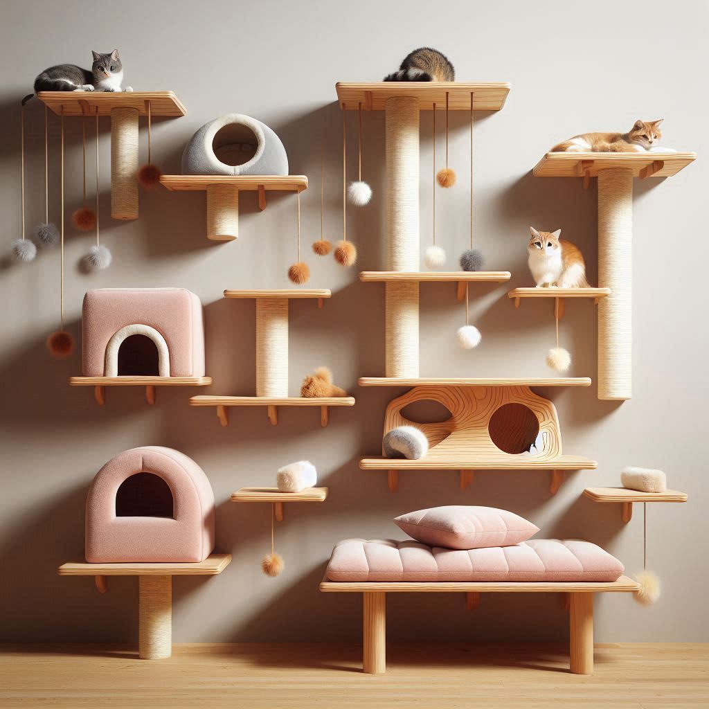 Algunos de los accesorios más utilizados para hacer un rascador de pared para gatos son: camas, escaleras, soportes con rascador, peldaños o estantes, caminos en escalada, incluso cuevas o casas entre otros.